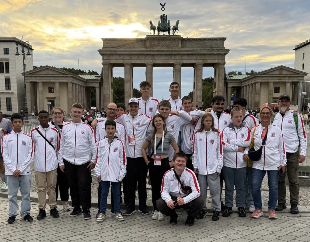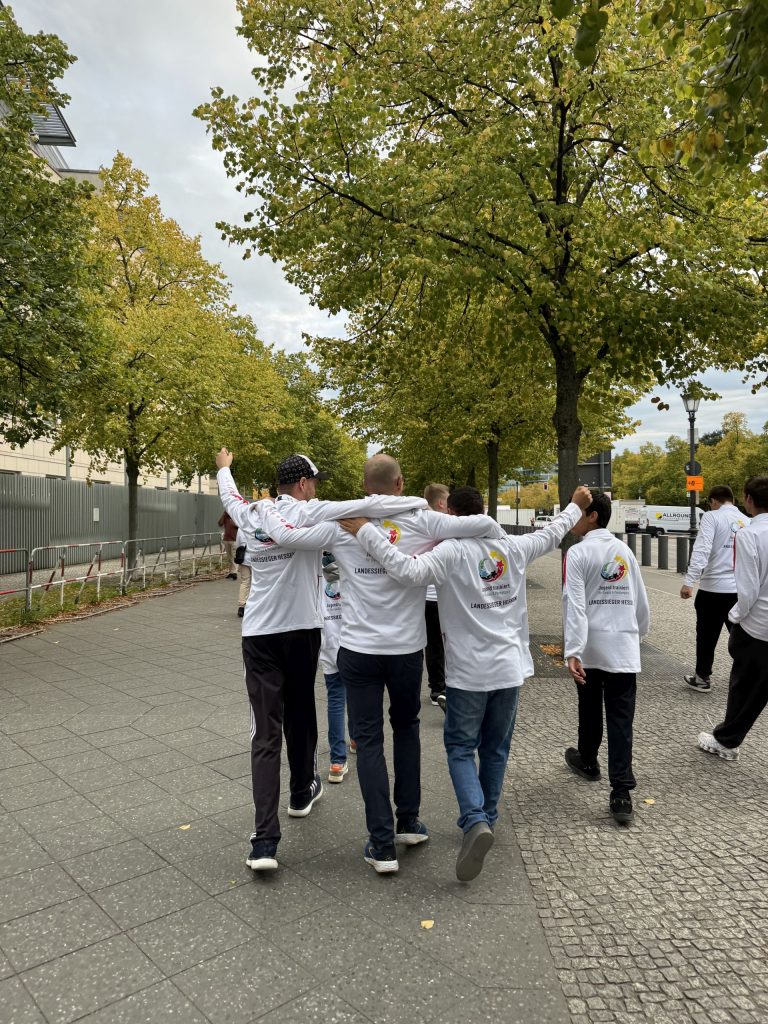 Sonntagmorgens starteten wir mit dem ICE nach Berlin. Nach anstrengenden sieben Stunden inkl. einem Umstieg in Hannover, erreichten wir unser Hostel. Viel Zeit zum Beziehen der Zimmer blieb jedoch nicht, denn es stand am Abend noch der Empfang in der hessischen Landesvertretung für alle Teams, die Hessen in den verschiedenen Disziplinen vertreten, an. Dies nutzte die Reisegruppe um das Trainergespann Wasserfuhr/Leun, sowie die weiblichen Begleiterinnen Bittner/Weihrauch für einen kurzen Besuch am Brandenburger Tor, wo kurz zuvor noch der jährliche Berlin-Marathon zu Ende gegangen war. In der hessischen Landesvertretung endete dann der offizielle Teil nach einer kurzen Begrüßung mit Burgern, Pommes und Eis.