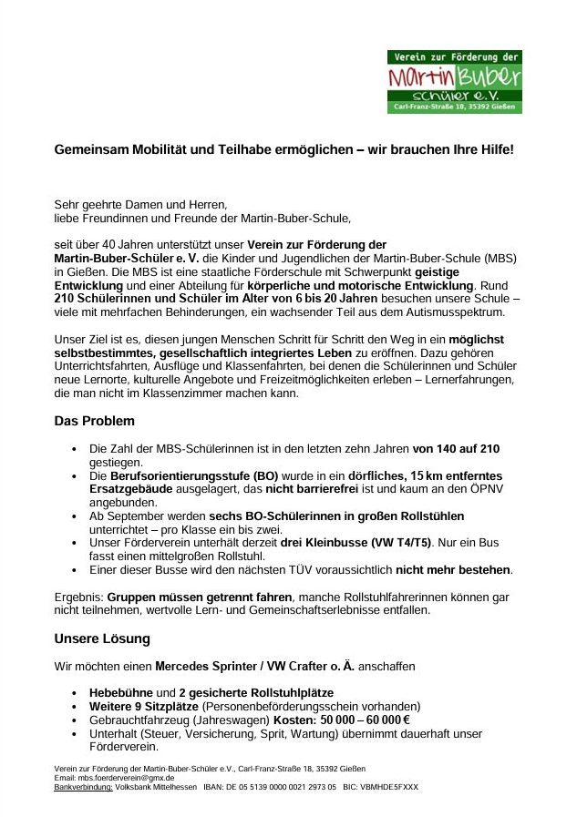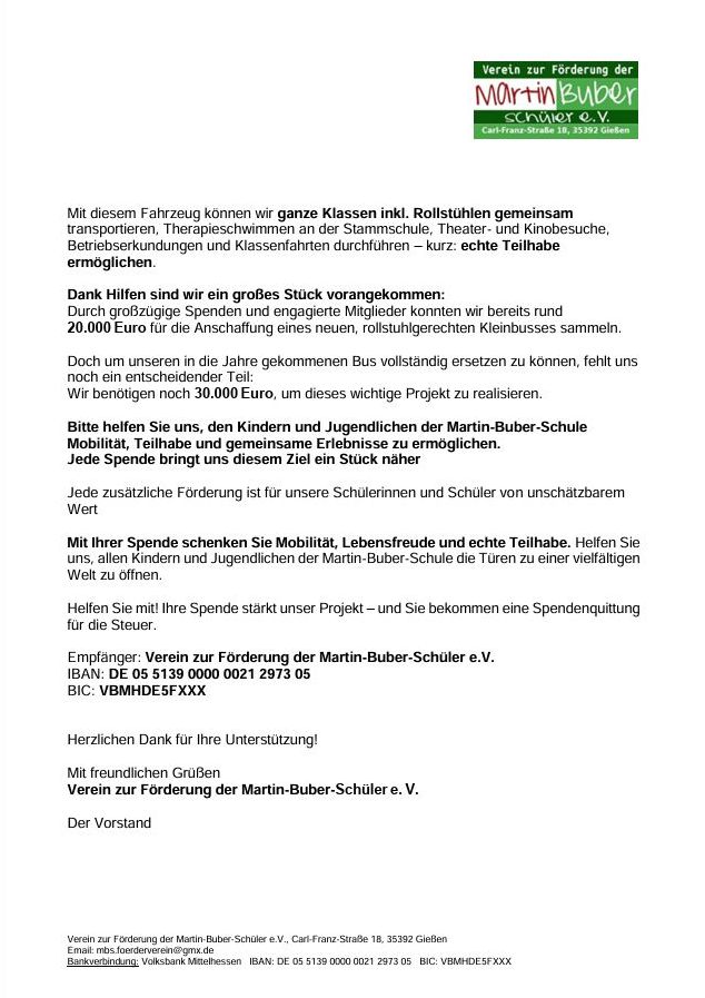 Wir haben in unseren Kiosk 100 Euro für den Förderverein gespendet. Damit wollen wir helfen einen neuen Schulbus zu kaufen. Wir haben das Geld durch unsere Harte Arbeit für die zufriedenen Kunden verdient, indem wir jeden Dienstag Müsliriegel, Brötchen, Waffeln, Obstspieße, Limo, und Lolis zubereiten und verkaufen. Die spende kommt nicht nur von uns sondern auch von den treuen Kunden. Wir hoffen das der neue Bus eine Heizung und eine Klimaanlage hat. Wir schlagen die Farben vor: bisschen Gold, bisschen Grün, bisschen Rot, Hauptsache bunt so wie wir. Und wir freuen uns.