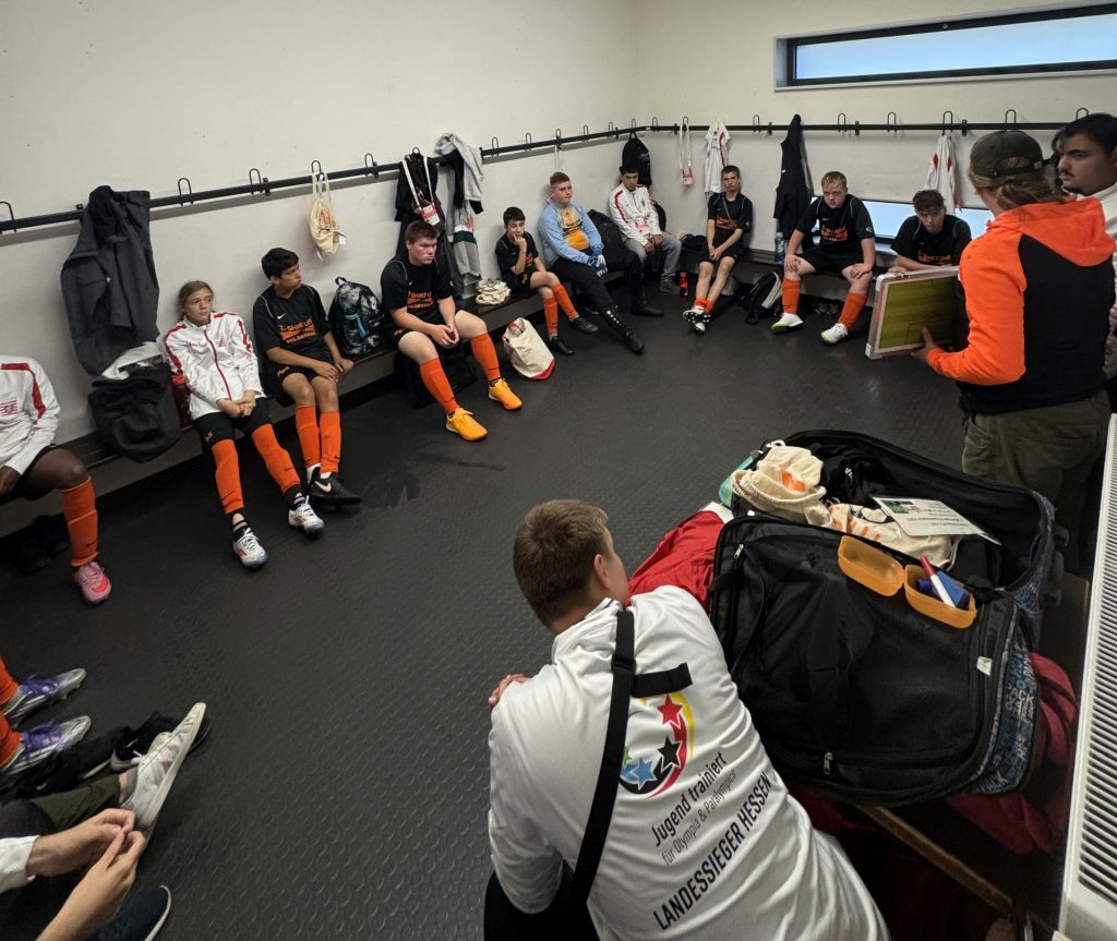Aufgrund der Tatsache, dass bei den deutschen Meisterschaften keine Schüler über 17 Jahre spielen dürfen, mussten wir schweren Herzens unsere Hessenmeister Cem, Adrian, Ashley, Elman und Justin ersetzen. Neben Elias, Max, Leon, Alicia, Julian und Lukas, rückten aus diesem Grund Tiziano, Rahul, Collin, Mo und Taha in den Kader nach. Außerdem erwartete uns anders als bei der Hessenmeisterschaft (Halle/6 gegen 6), diesmal ein Kunstrasen im Freien (7 gegen 7).